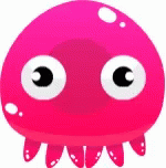 An excited, pink cartoon squid with big eyes and tentacles happily jumps on a white background.