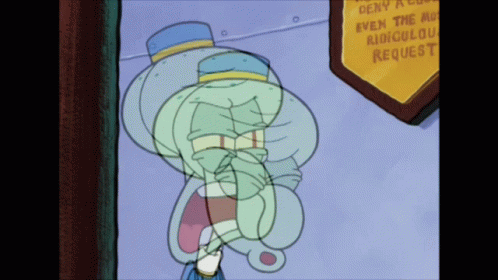 Squidward Tentacles from Spongebob Squarepants reacts with shock in front of a 'DENY' sign.