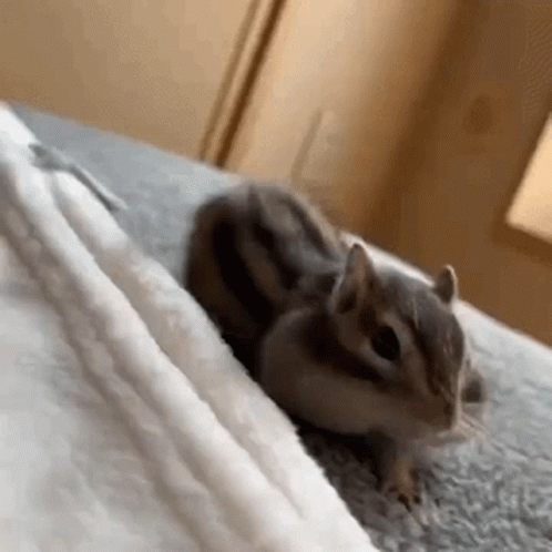 An adorable chipmunk wakes up, puffing its cheeks and stretching its tiny paws on a soft blanket.