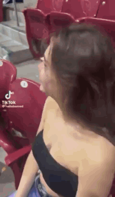 Squishtwt Squishtwtt smiling and laughing in a stadium with red seats, wearing a black top.