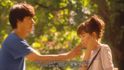 A man gently squishes a woman's cheeks while telling her 'Don't make excuses,' to which she replies 'Okay.'