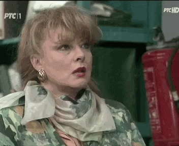 Djilda from the Serbian TV series Srecni Ljudi reacts with an exasperated expression, looking upwards.