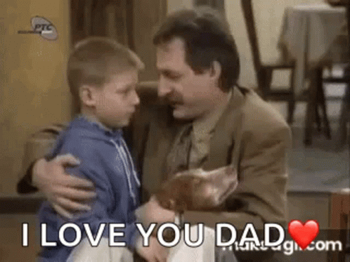 Srecniljudi scene: A heartwarming hug between a father and son with 'I Love You Dad' text.