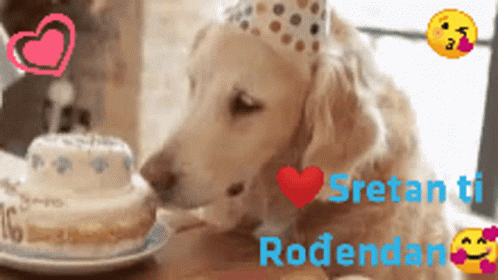 A golden retriever dog wearing a party hat sniffs a birthday cake, with 'Happy Birthday' text overlay.