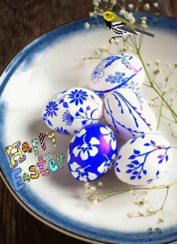 Beautiful blue and white decorated Easter eggs arranged on a plate, with a 'Happy Easter' greeting.