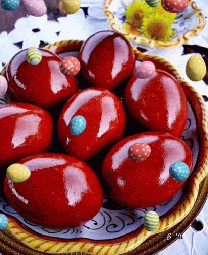 Vibrant red Easter eggs in a decorative bowl, surrounded by animated colorful patterned mini eggs, celebrating Sretan Uskrs.