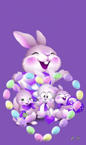 A joyful cartoon featuring a family of Easter bunnies surrounded by colorful sparkling Easter eggs arranged in a heart shape.