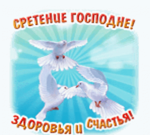 Animated greeting for the Meeting of the Lord (Sretenie Gospodne), wishing health and happiness with flying doves.