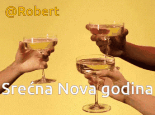 People toast with champagne glasses, celebrating the New Year with a festive message.