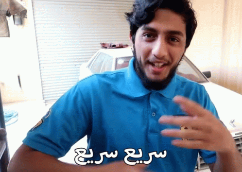 Man in a blue Ferrari polo shirt enthusiastically saying "fast fast" in Arabic, gesturing with excitement.