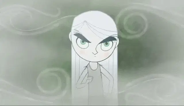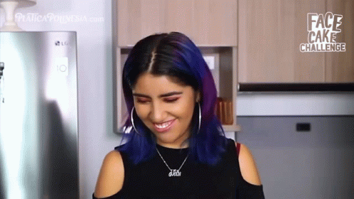 Karen Polinesia makes a playful shushing gesture, smiling brightly in a modern kitchen setting.
