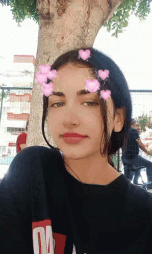 Young woman with a heart filter on her face, smiling and posing for the camera in a black shirt.