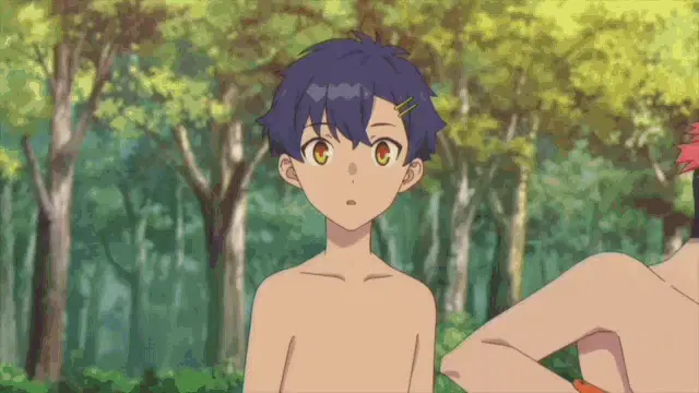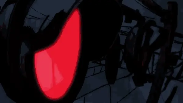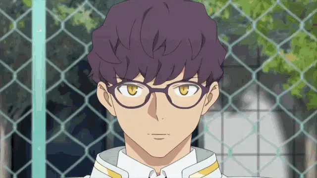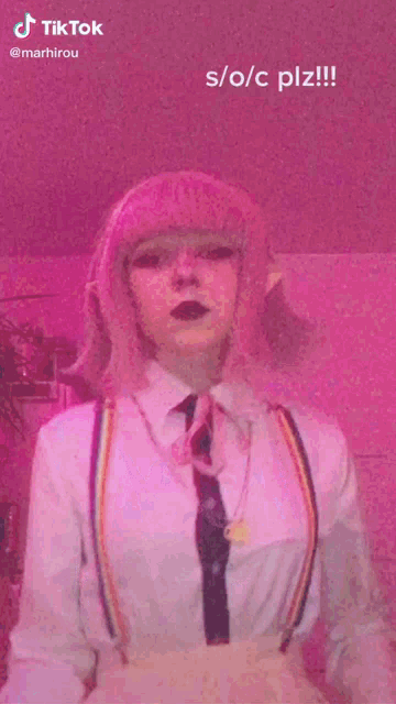 Person with pink hair, elf ears, and dark lipstick in a white shirt, tie, and rainbow suspenders.