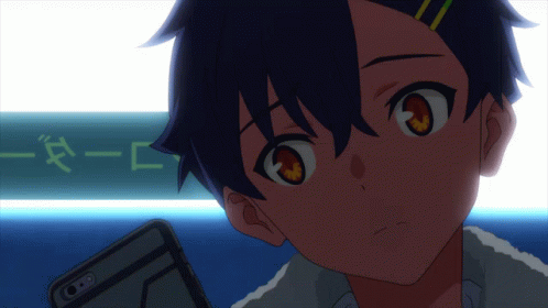 Asanaka Yomogi from SSSS.Dynazenon holds a smartphone, looking intently at the screen.