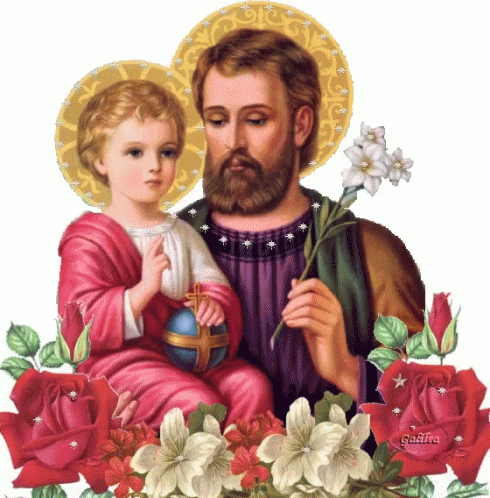 St. Joseph holding Child Jesus, surrounded by vibrant red and white flowers in a religious painting.