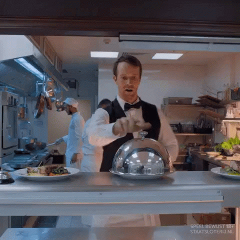 A waiter in a restaurant kitchen dances excitedly, revealing a Staatsloterij lottery ticket under a cloche.