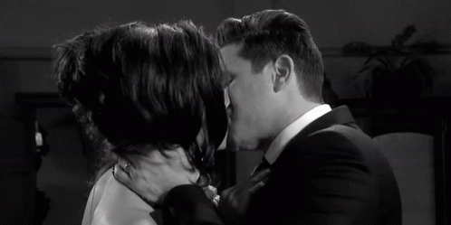 Stefan O. Dimera and Gabi Hernandez Dimera share a passionate kiss in this romantic scene from Days of Our Lives.