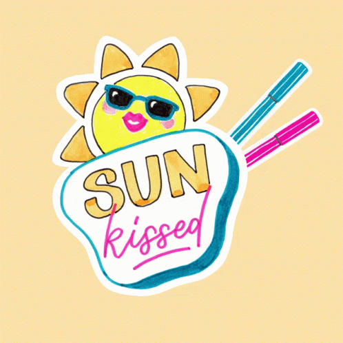 A vibrant sticker featuring a cartoon sun wearing sunglasses with 'SUN kissed' text and Stabilo markers.