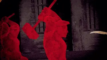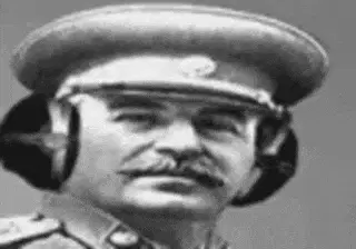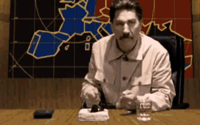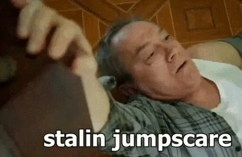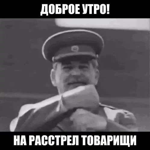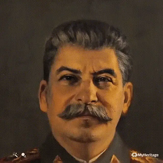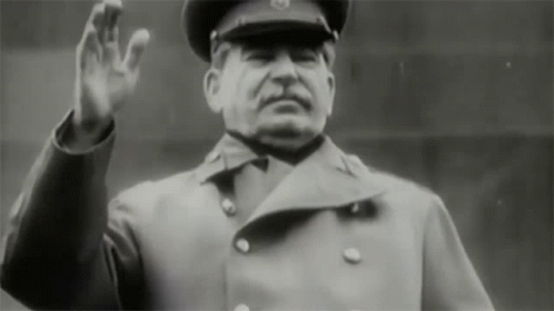Joseph Stalin in military uniform, waving his hand in a black and white animated photo.