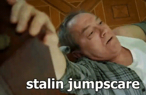 A man reacts to a sudden Stalin jumpscare, featuring a bust of Stalin and overlaid text.