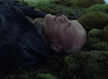 A man, Alexander Kaidanovsky, lies in a mossy landscape in a scene from Andrei Tarkovsky's film Stalker.