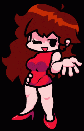 FNF Girlfriend stands, winks, and sways her hair, smiling with her hand on her hip.