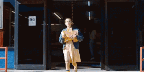 Eleven from Stranger Things exits a store, carrying multiple boxes of her favorite Eggo waffles.