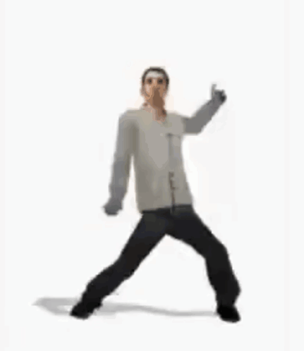 Stanley from The Stanley Parable performs an exaggerated dance, moving his arms and legs in a wide stance.