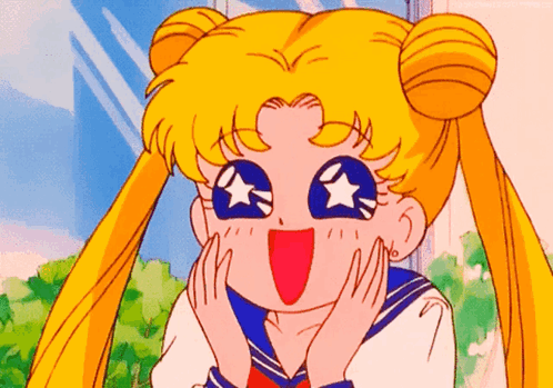 A Sailor Moon character shows extreme excitement, with a star visible in her eye, expressing happiness.