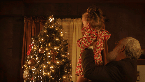 A man helps a little girl place a star on a Christmas tree, evoking the spirit of Brenda Lee's holiday classic.
