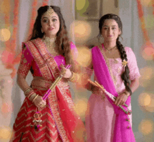 Devoleena Bhattacharjee and Sneha Jain in vibrant traditional attire, holding dandiya sticks for a festive dance.