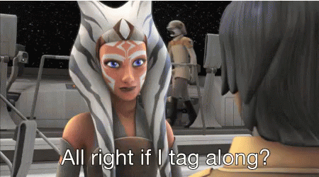 Ashoka Tano from Star Wars asks, 'All right if I tag along?' to a companion in a spaceship.
