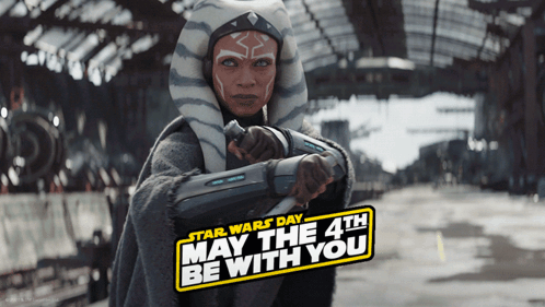 Ahsoka Tano from Star Wars, holding two white lightsabers, celebrating Star Wars Day.
