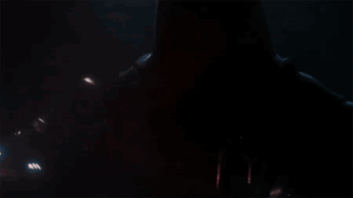 Darth Revan from Star Wars stands in the dark, wielding a glowing red lightsaber.