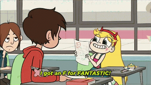 Star Butterfly proudly shows off her "F for FANTASTIC!" grade to Marco Diaz in class.