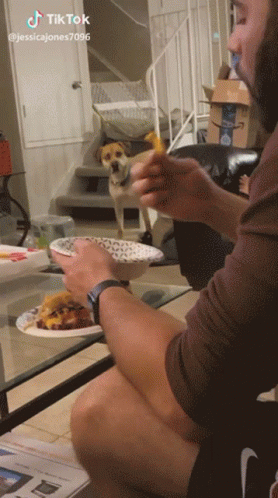 A hungry dog stares intently at a man eating food, hoping for a bite.