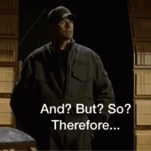 A character from Stargate SG-1 stands in a doorway with the words 'And? But? So? Therefore...' displayed.