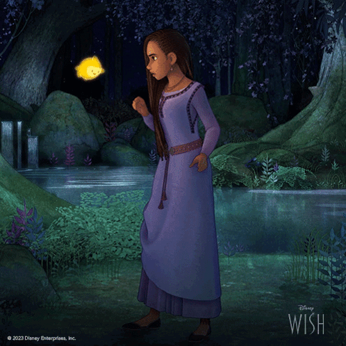 Asha is startled by the magical Star in a scene from Disney's Wish, featuring character Asha.