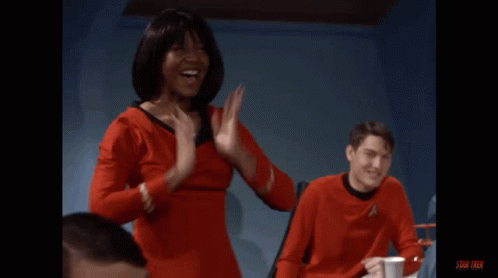 Uhura from Star Trek dances joyfully in her red Starfleet uniform, with a male crewmate smiling.