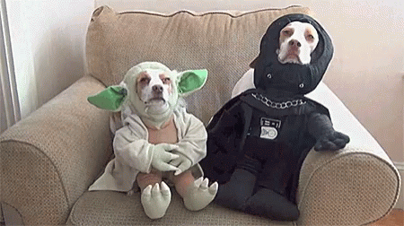Two adorable dogs dressed as Yoda and Darth Vader from Star Wars, ready for Halloween.