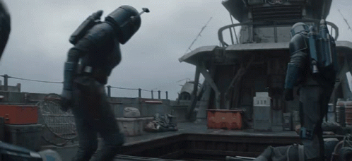 A Mandalorian character, possibly Din Djarin or Bo Katan, stands on a ship deck under a cloudy sky.