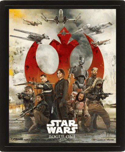 Iconic Star Wars: Rogue One movie poster featuring Jyn Erso, Cassian Andor, K-2SO, and the Rebel Alliance.