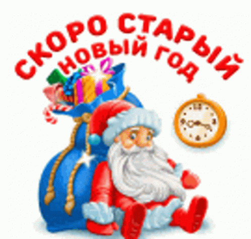 An animated Santa Claus sits beside a bag of gifts, with a clock, announcing "Soon Old New Year" in Russian.