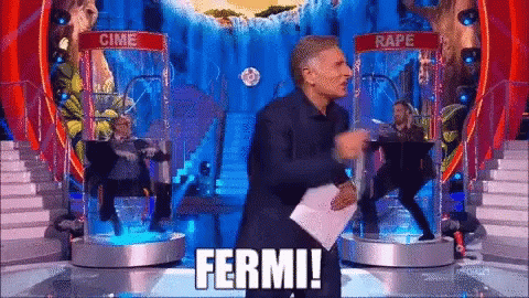 Paolo Bonolis on Ciao Darwin exclaims 'Fermi! Che qui succede un putiferio!' to control the chaos on stage.