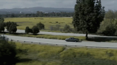 A Station19 Ford F150 truck drives on a highway through a green, rural landscape.