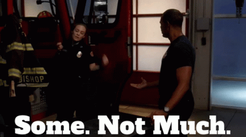 a man and a woman are standing in front of a fire truck and the words some not much are above them