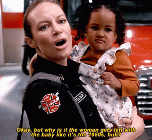 Maya Bishop (Danielle Savre) from Station 19 questions traditional 1950s gender roles in childcare while holding a baby.