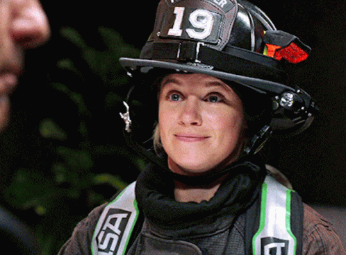 Station19's Maya Bishop, a firefighter, smiles while wearing her helmet with '19' visible.