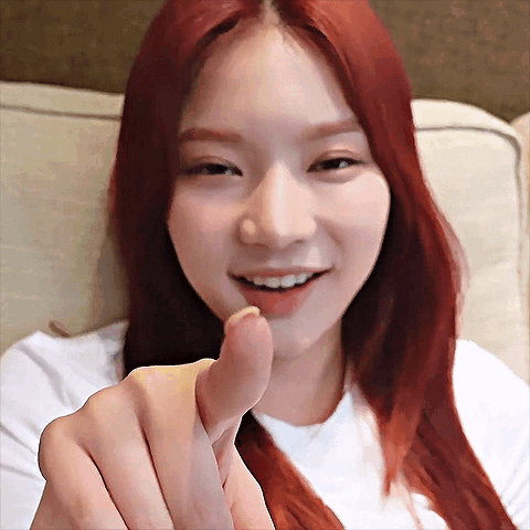Stayc Isa, the K-pop idol, points at the camera and smiles charmingly.