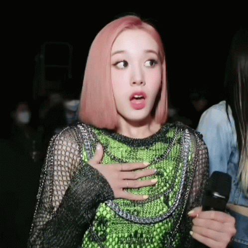 Stayc J (Jang Yeeun/Jaeyi) with a surprised, wide-eyed expression, pink hair, and green mesh top.
